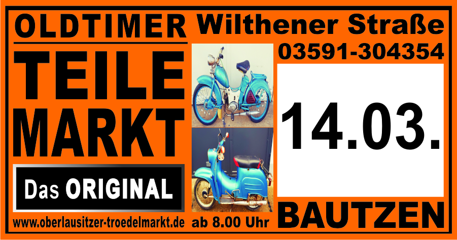 Unsere nächsten Veranstaltungen: - 07.02.2026 Trödelmarkt Wilthen SB - Halle - 08.02.2026 Modellbahn Börse Wilthen SB Halle - 07.03.2026 Trödelmarkt Bautzen Wilthener Straße - 14.03.2026 Oldtimer Teilemarkt